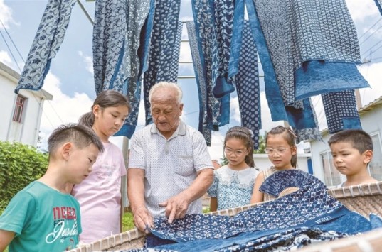 頂部昨天,在通州區(qū)二甲鎮(zhèn)正興染坊,國(guó)家級(jí)非遺——南通藍(lán)印花布印染技藝傳承人王振興向孩子們介紹藍(lán)印花布的制作技藝。暑假期間,二甲鎮(zhèn)新時(shí)代文明實(shí)踐站組織小學(xué)生們開(kāi)展藍(lán)印花布體驗(yàn)活動(dòng),讓孩子們近距離感受傳統(tǒng)技藝魅力,傳承非遺文化。 翟慧勇攝