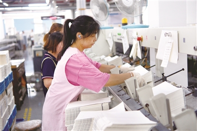 頂部新學(xué)期臨近,昨日,承接部分江蘇省和南通市中小學(xué)教材教輔900萬(wàn)余冊(cè)印刷任務(wù)的南通韜奮印刷有限公司員工正全力進(jìn)行教輔材料印刷工作,確保在開(kāi)學(xué)之際能夠“課前到書(shū),人手一冊(cè)”。 記者 徐培欽攝